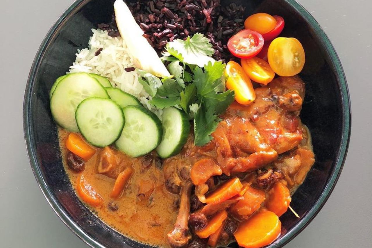 Poulet à l’Afghane accompagné de son duo de riz, carottes, concombres et tomates cerises.